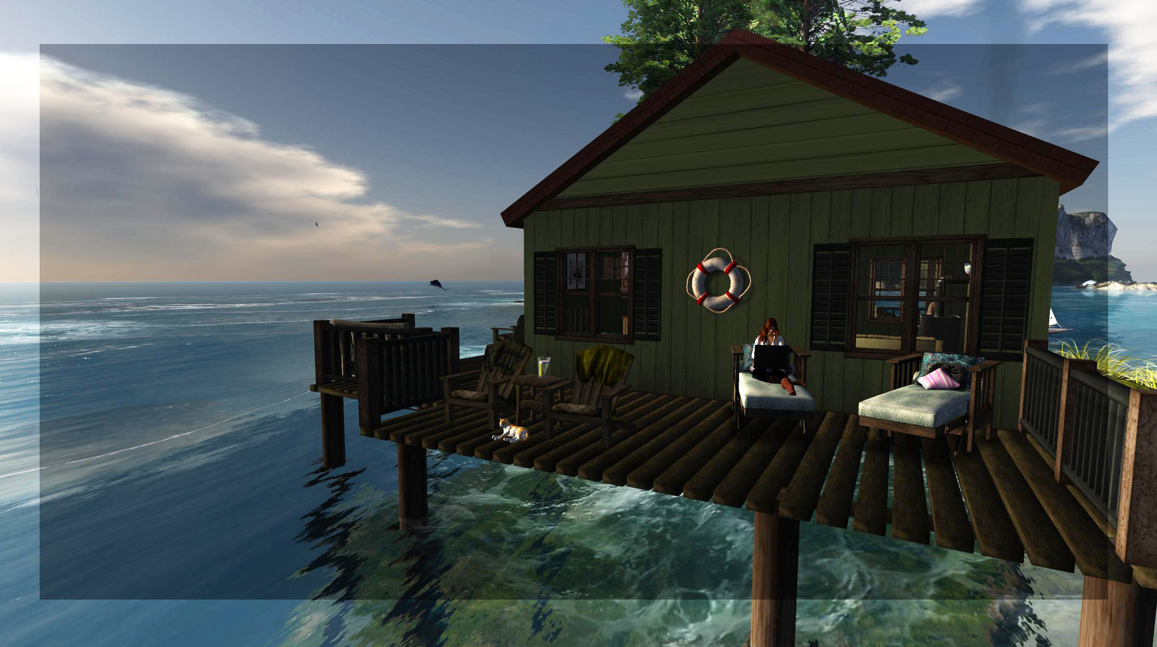 fishing cabin with romie_001 copyPssst, SecretSlayer here, have you been to the Sea of Nurnen?  More specifically to the little fishing cabin on the small island on the eastern edge of the sim?  Ty said in the June Field Notes that you could “Fish off the deck or just relax with a meal or cuddles in the cabin itself.”  Pfffft. Well there’s that, but you have to check out this place. Every seat (and there are lots of them) has a gazillion animations, many complete with the appropriate object to play with – guitars, drinks, computers, fishing poles, phones, male and female poses, singles, friends, cuddles…you can fish, dine looking out over the sea, serenade yourself or whoever, spot the dolphin school passing by, well, I’m just sayin…it’s worth a TP.