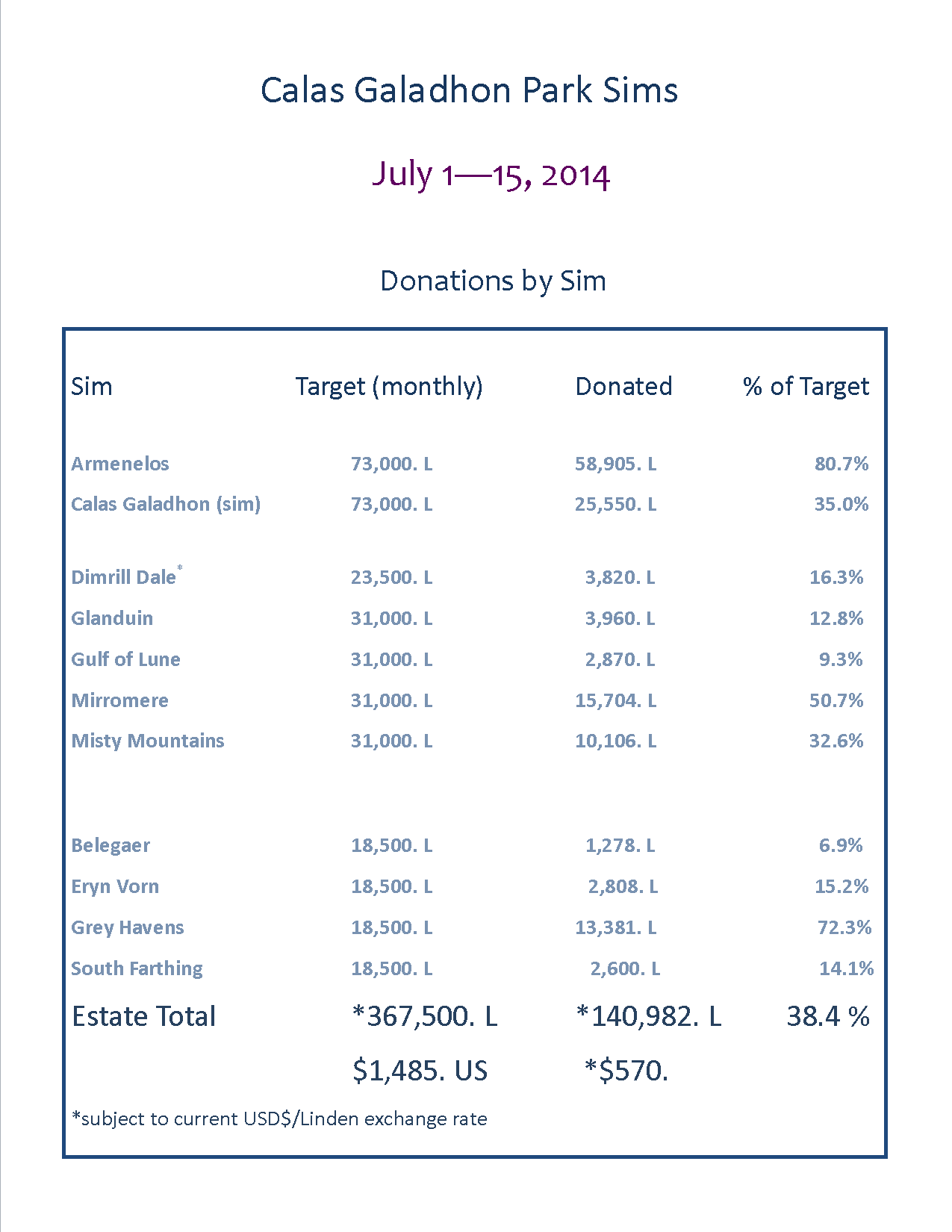 As we’ve made clear in the monthly ‘Calas Field Notes’ from March through June ,Truck and I are not able, after five years or doing so, to continue funding the full monthly cost of the sims. It is primarily through the kind and generous support of it’s visitors and group members that all of the 11 parkland sim of Calas Galadhon remain.