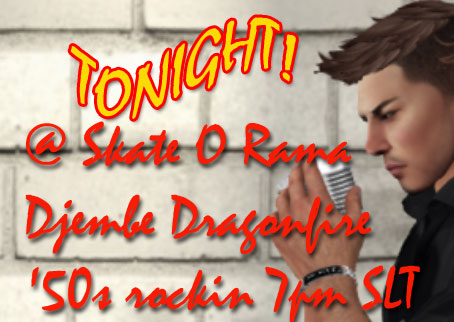 #SecondLife DJEMBE DRAGONFIRE will be rockin us at SKATE O RAMA TONIGHT, JULY 9, 7PM SLT! Grab your skates and your 50’s garb and come party with us! (We have skates for you as a gift & 50s dress is optional;) Here’s your bus ticket – it will drop you off on Route 66 in front of SKATE O RAMA – be careful crossing the highway, those semis are ruthless!