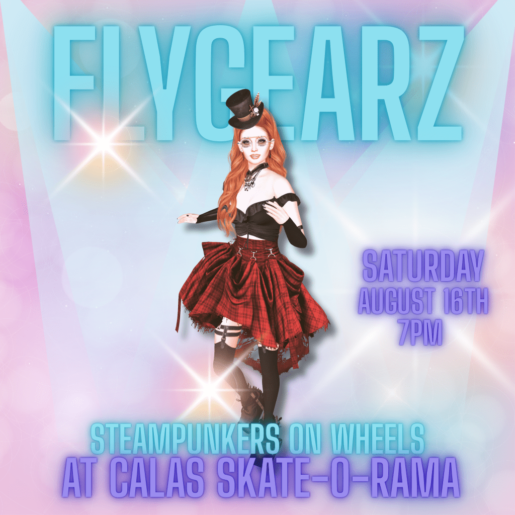 7PM – Join us tonight as our own Jenna Dirval’s FlyGearz puts FlyGearZ on wheels! Imagine being thrown forward 50 or 60 years and you find your steampunky self at Calas’ Skate-O-Rama?! Well that’s exactly what’s gonna happen if you join us on TONIGHT (August 16th at 7pm SLT)! We have a special show that will have you skate-dancing in time and in rhythm with the music. FlyGearZ is an immersive and inclusive dance event where the audience members are the Stars of our show! No sitting in seats when Choreographer, Jenna Dirval, starts dancing your pixels! Steampunk theme and while costumes are always encouraged; they are never required! Please keep those scripts under 100 and no personal particles. Here’s your ride to SKATE O RAMA: http://maps.secondlife.com/secondlife/EREBOR/250/126/2325